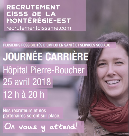 Il y aura le 25 avril 2018, de 12h00 à 20h00, une journée de recrutement pour le CISSS de la Montérégie-Est.