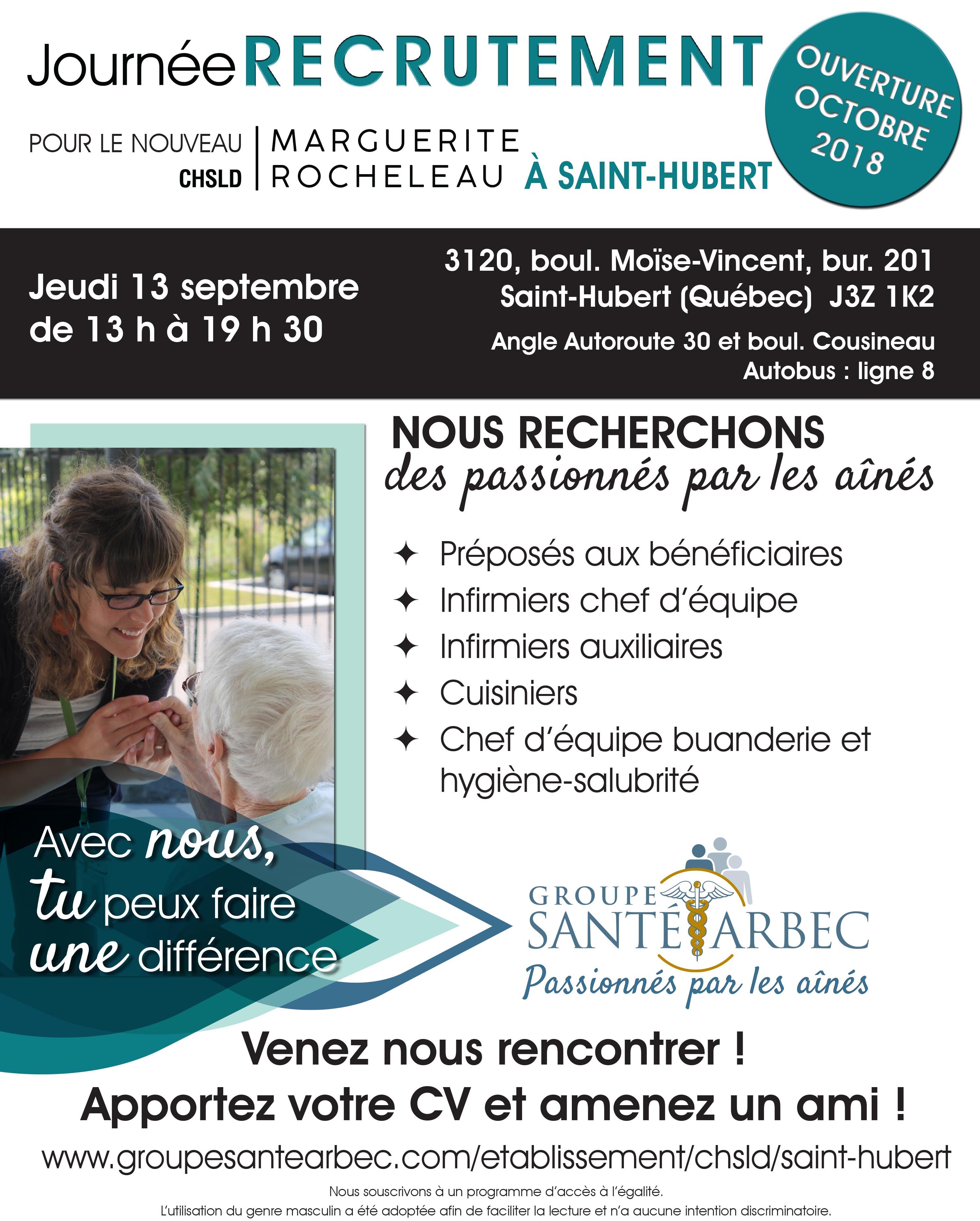 Le CHSLD Marguerite-Rocheleau fera une journée de recrutement le 13 septembre prochain, de 13h00 à 19h30.